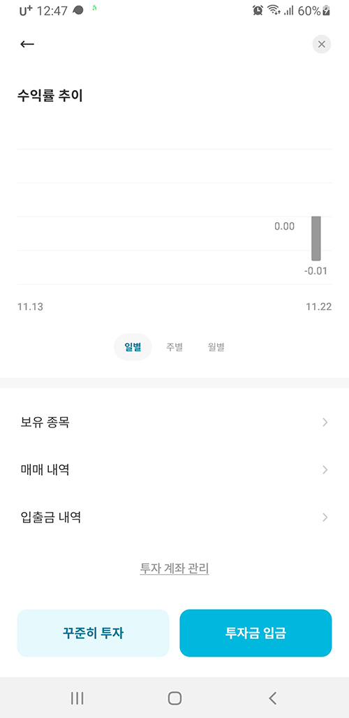 월요일 오늘 알림창으로 들어가보니 투자를 시작했다고 나오네요.