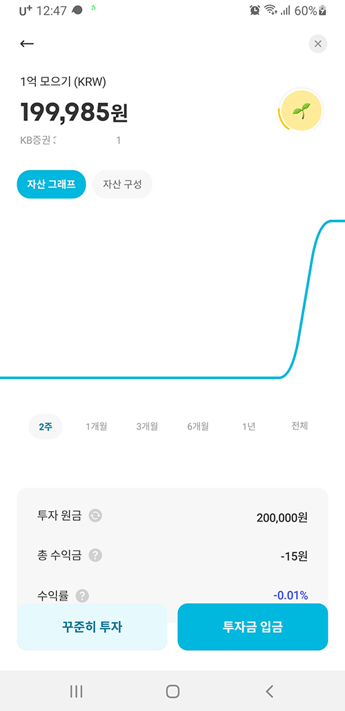 통장을 만든 후, 20만원부터 투자를 할 수 있다고 해서 일단 20만원을 입금했습니다.